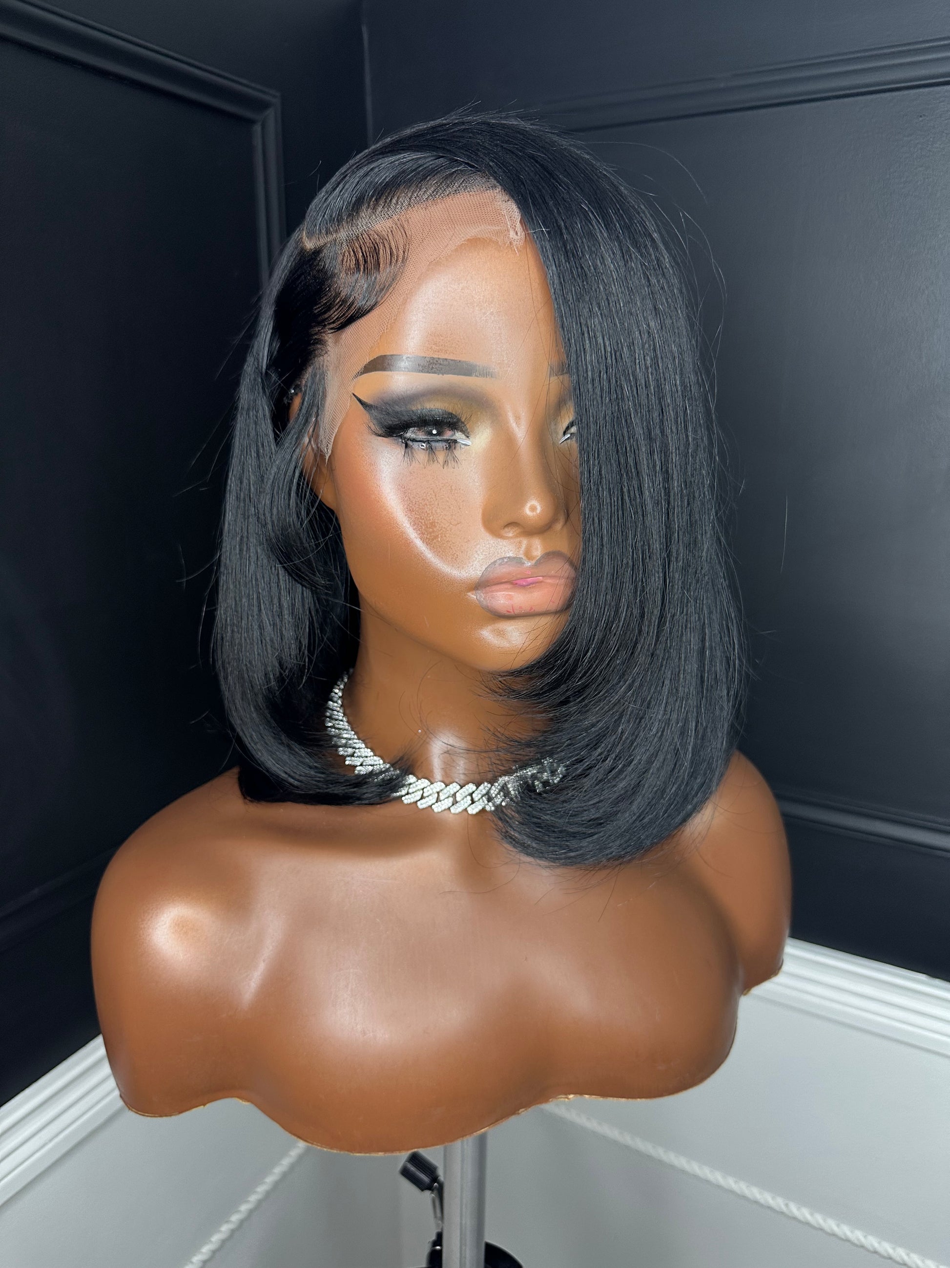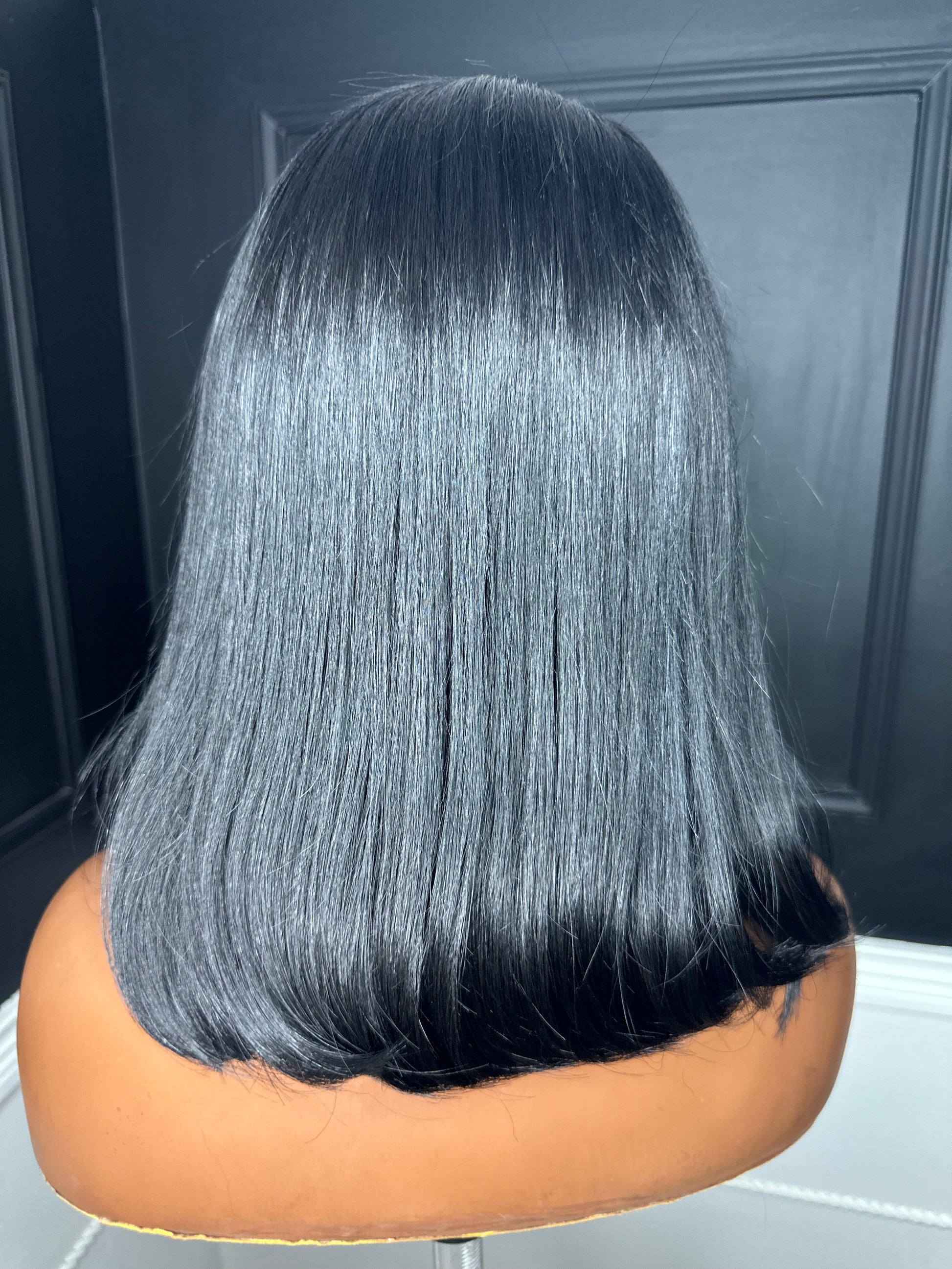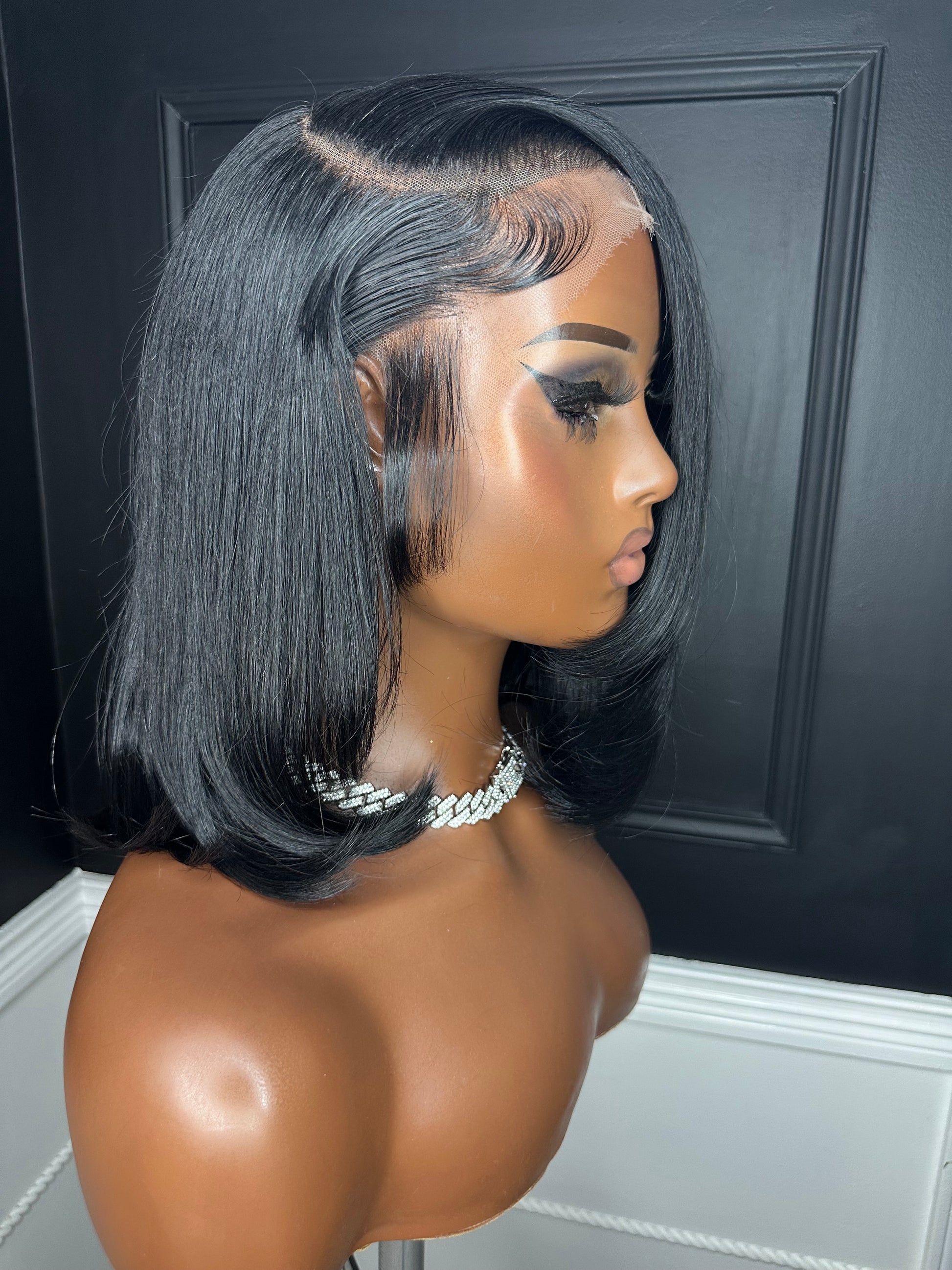 Style: Blunt cut with a layered bang and deep right side part